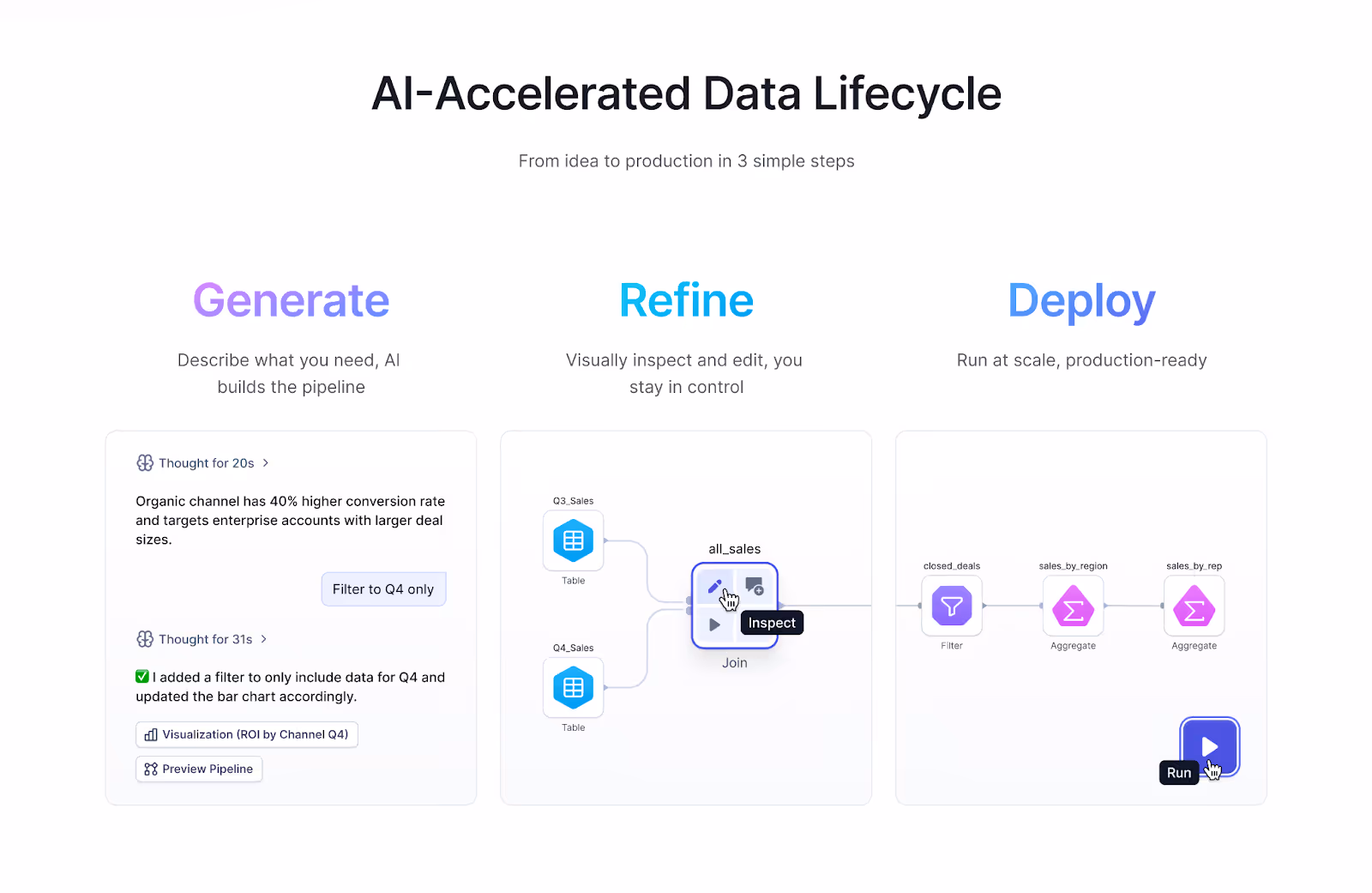 Users explore data through AI-generated reports and visualizations, generate and refine workflows visually, receive domain-aware guidance from agents, and push results directly into downstream systems. Insight, preparation, and action happen together—without context switching.